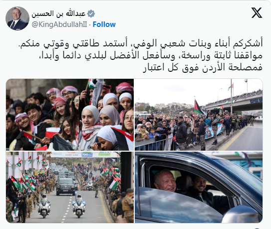 وقال جلالته في المنشور “أشكركم أبناء وبنات شعبي الوفي، أستمد طاقتي وقوتي منكم، مواقفنا ثابتة وراسخة، وسأفعل الأفضل لبلدي دائما وأبدا، فمصلحة الأردن فوق كل اعتبار”.