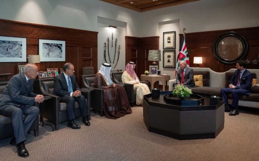 وترأس الوفد وزير الخارجية السعودي الأمير فيصل بن فرحان، وضم كلاً من وزير الخارجية البحريني عبداللطيف بن راشد الزياني، ووزير الخارجية المصري بدر عبدالعاطي، والأمين العام لجامعة الدول العربية أحمد أبو الغيط، إلى جانب نائب رئيس الوزراء ووزير الخارجية وشؤون المغتربين أيمن الصفدي.