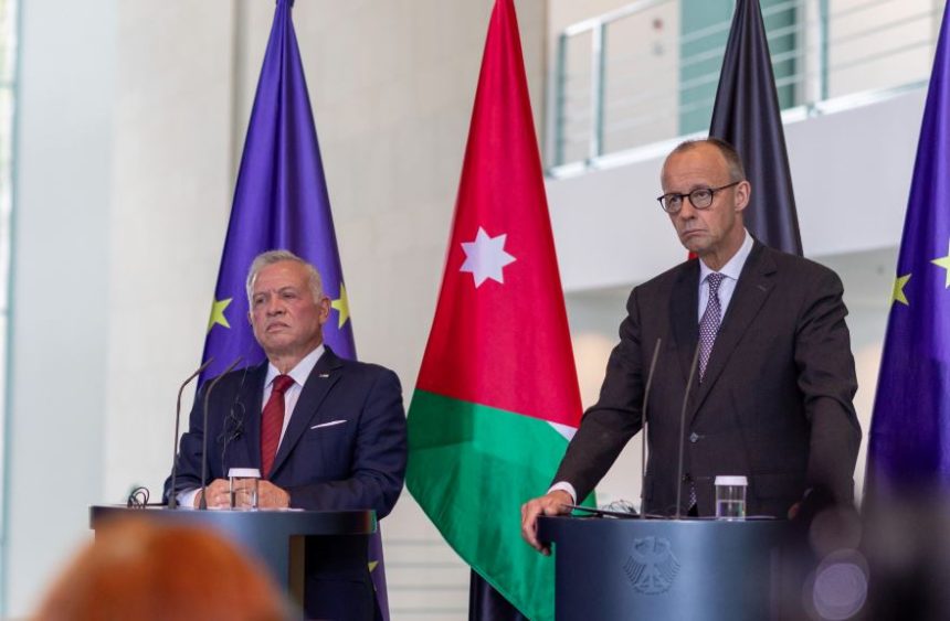 من جهته، أكد المستشار ميرتس التزام ألمانيا بدعم الأردن في جهوده الإنسانية، وأشاد بدور جلالة الملك الإقليمي، مؤكداً موقف بلاده الرافض لضم الضفة الغربية أو تهجير سكانها، ودعمه لوقف إطلاق النار وتحقيق السلام على أساس حل الدولتين.