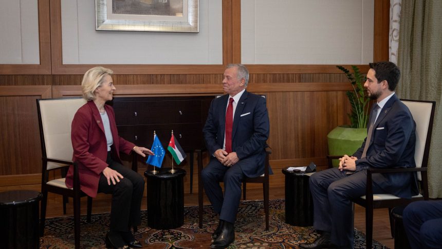 وفي لقائه مع رئيسة المفوضية الأوروبية، شدد جلالته على أهمية استمرار التنسيق بين الأردن والاتحاد الأوروبي حيال التطورات الإقليمية، بما يعزز الأمن والاستقرار ويخدم المصالح المشتركة، مشيراً إلى أهمية توسيع آفاق التعاون الثنائي، خاصة في تنفيذ المشاريع الكبرى المشتركة.